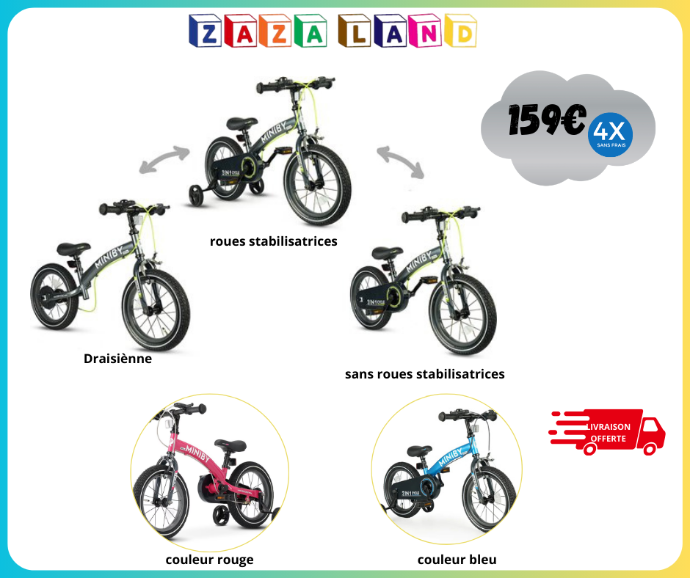 commence comme draisienne, puis se transforme en vélo avec pédales + roues stabilisatrices, et enfin en vélo classique